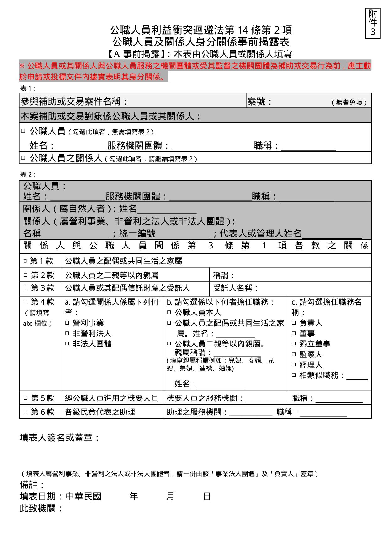 (三)【A.事前揭露】公職人員及關係人身分關係揭露表
