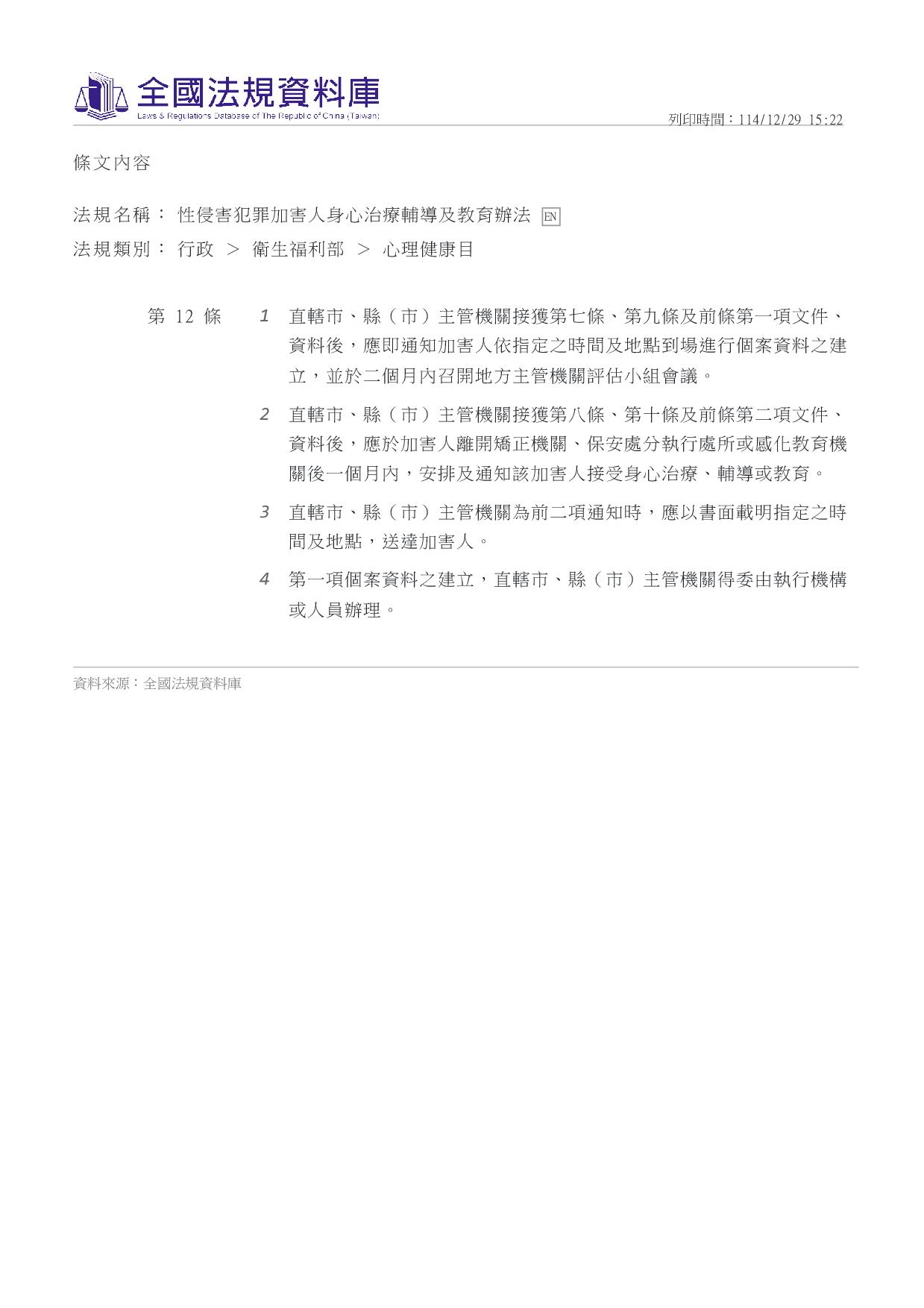 依據:性侵害犯罪加害人身心治療輔導及教育辦法第4條第2項及同法第12條。