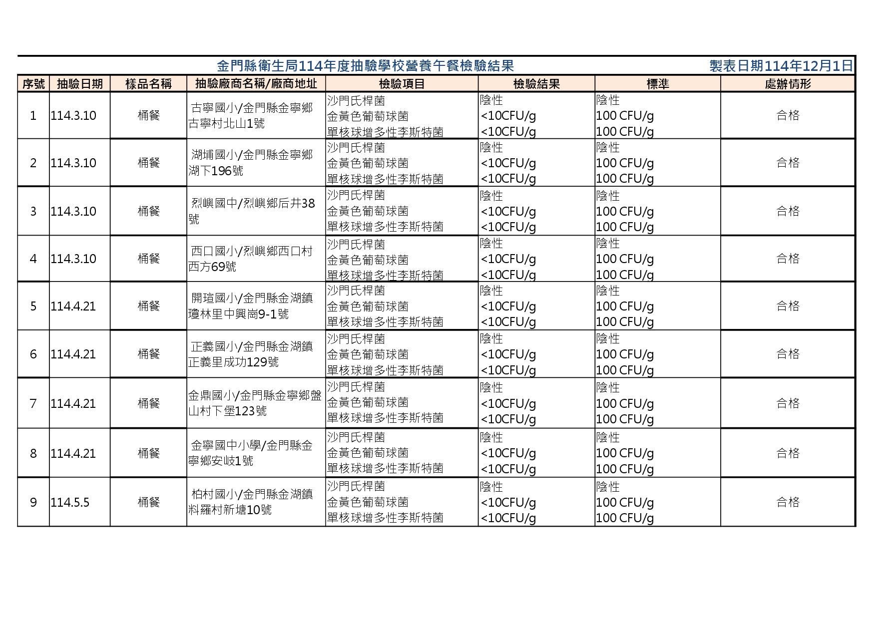 金門縣衛生局114年度抽驗學校營養午餐檢驗結果