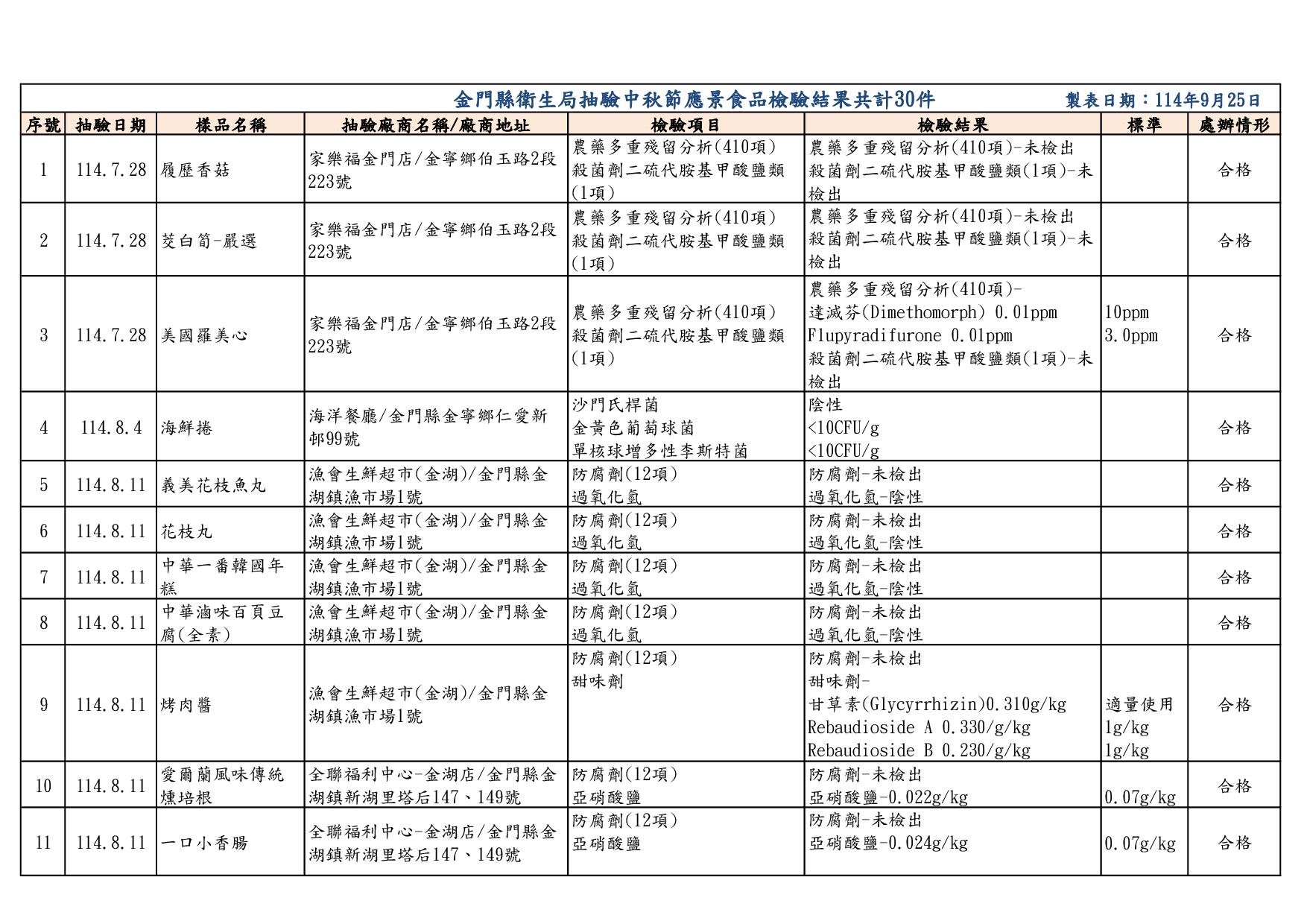 金門縣衛生局抽驗中秋節應景食品檢驗結果共計30件