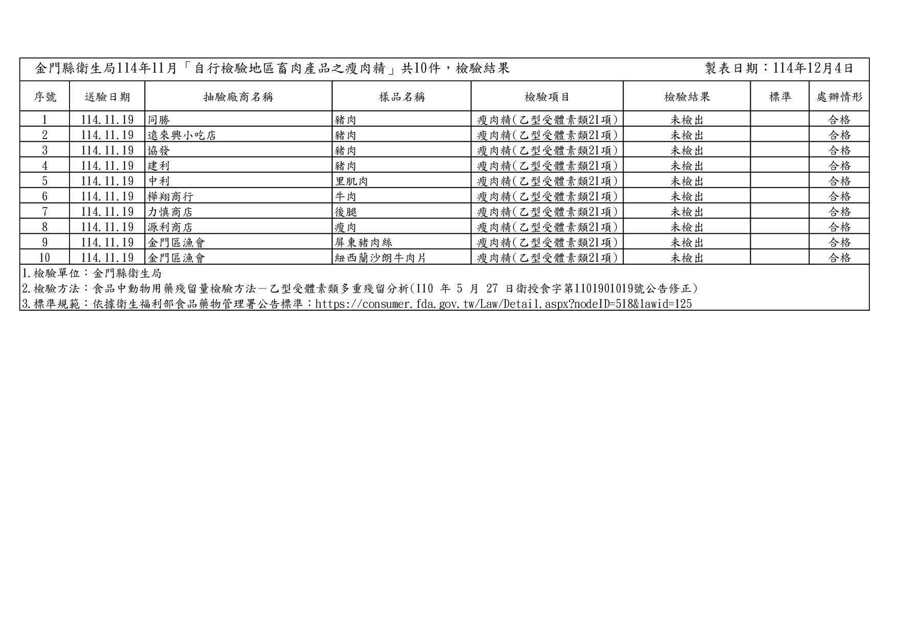 114年11月抽驗地區畜肉產品瘦肉精檢驗結果