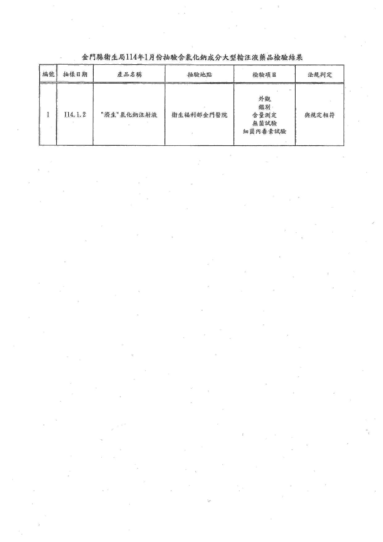 金門縣衛生局114年1月份抽驗含氯化鈉成分大型輸注液藥品檢驗結果