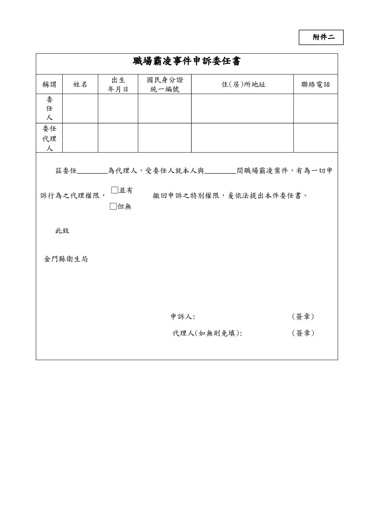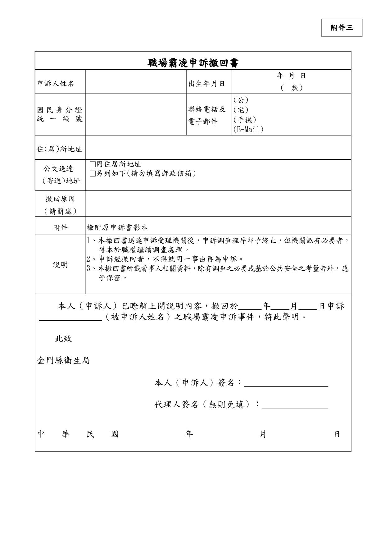 金門縣衛生局及所屬衛生所職場霸凌防治、申訴及調查處理要點 (1)職場霸凌申訴諮詢專線電話:082-330697#207 (2)職場霸凌申訴諮詢專用傳真:082-336931 (3)職場霸凌申訴諮詢專用電子信箱:yeachin1@mail.kinmen.gov.tw (務請來電確認)